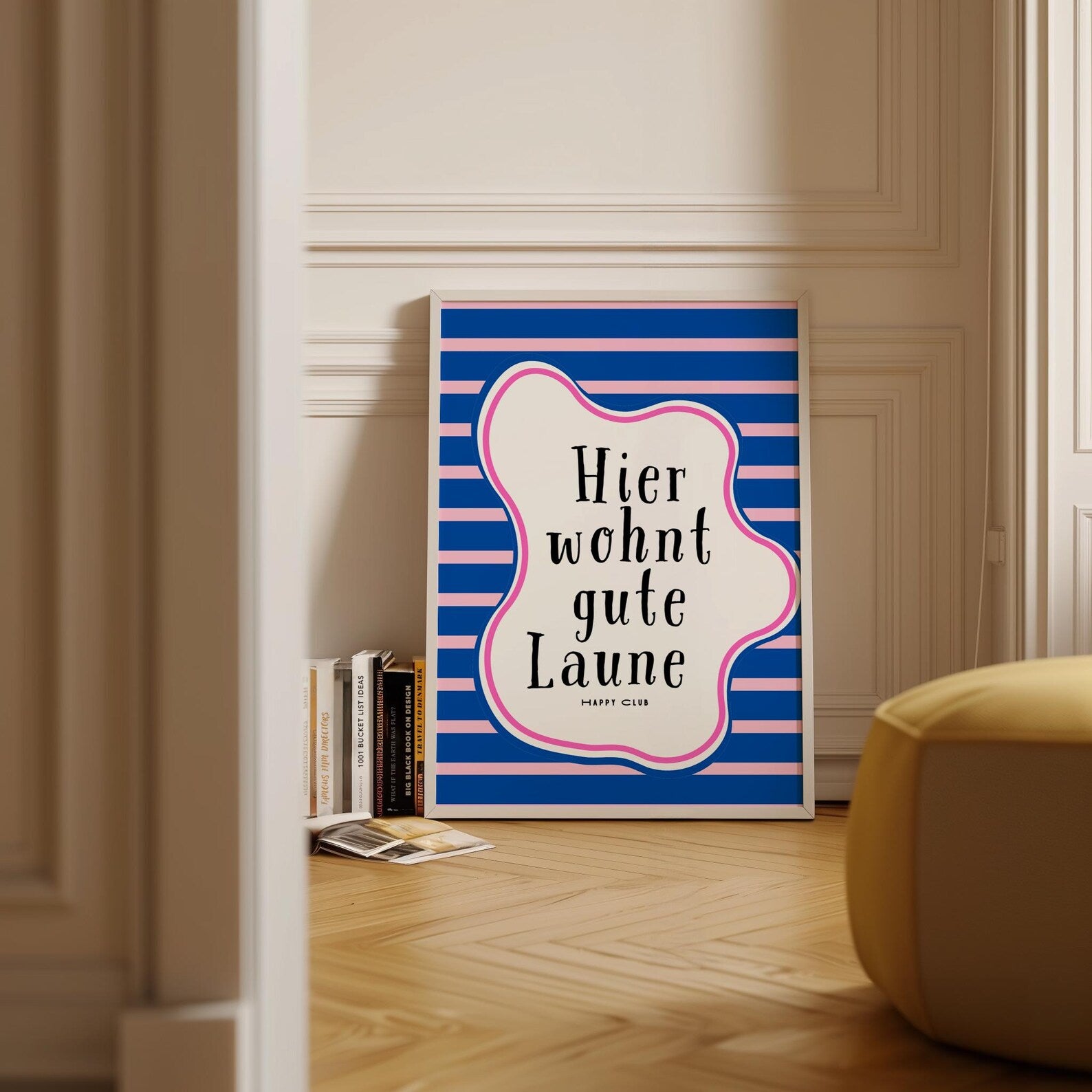 💙 „Hier wohnt gute Laune“ – Buntes Typografie-Poster im modernen Retro-Stil