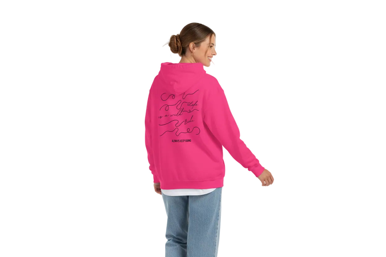 Ein kuscheliger Hoodie für alle, die Komfort und Statement-Design lieben! Perfekt für kühlere Tage – weich, warm und hochwertig verarbeitet. Die Rückseite ziert der motivierende Spruch: Life is a wild ride – Always keep going.