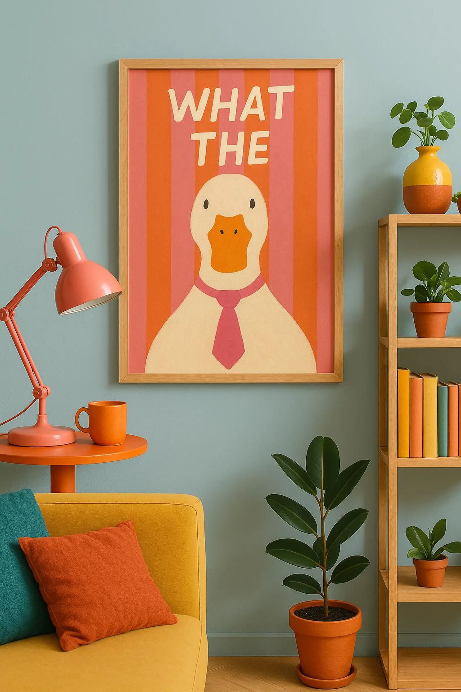 🦆 WHAT THE DUCK Poster – Humorvolle Wandkunst mit Stil & Augenzwinkern, – Lustige Wanddeko im Retro Pop Art Stil – Mid-Century Modern Kunst für Wohnzimmer, Büro oder Homeoffice